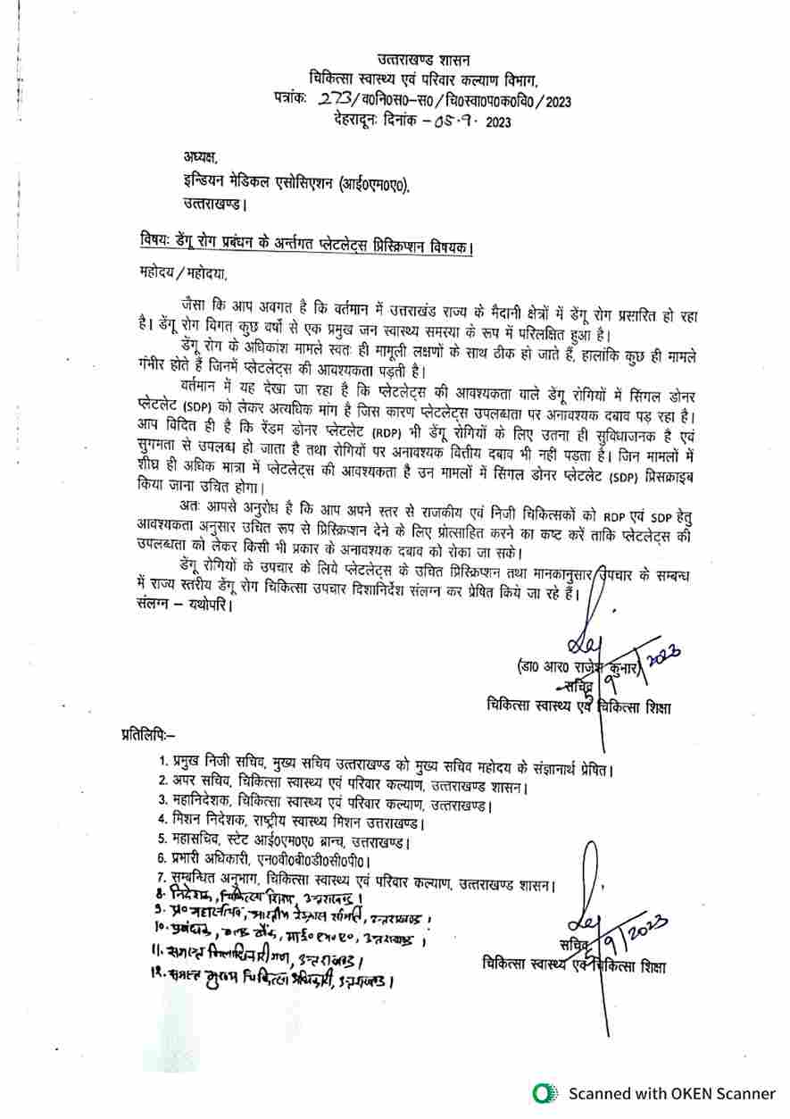 स्वास्थ्य सचिव डॉ आर राजेश कुमार ने डेंगू रोग के इलाज के लिए प्लेटलेट्स के समुचित प्रबंधन को आईएमए अध्यक्ष को लिखा पत्र